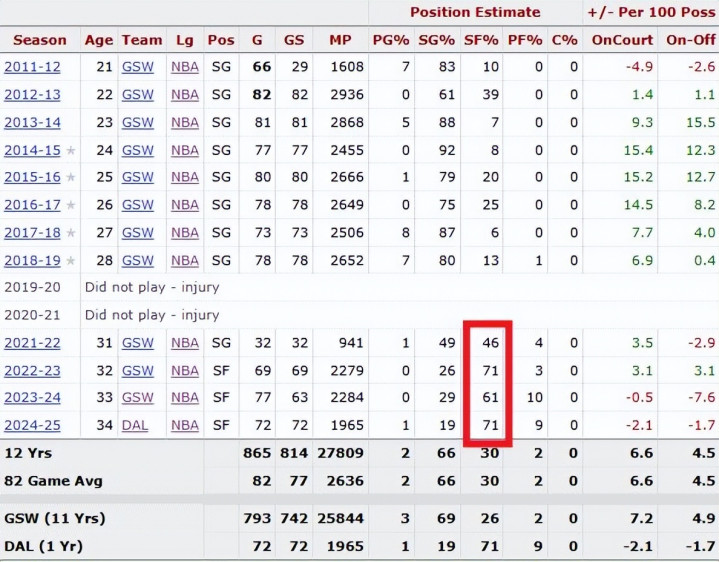 说到这需要说明的是,连续两季赛季报销后自20-21季起克莱就开始主打小前锋。如下图所说占比值分别为46%、71%、61%和71%。