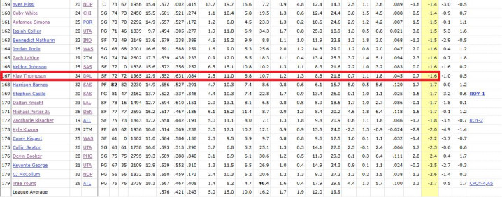 近三季,受限于此前大伤带来的影响克莱防守真实正负值分别为-1.7、-1.5和-1.6。拿24-25季的-1.6来说,在上榜的179名球员中排在第167,看得出来伤病带来的影响已经让他的防守早已不复当年之勇。