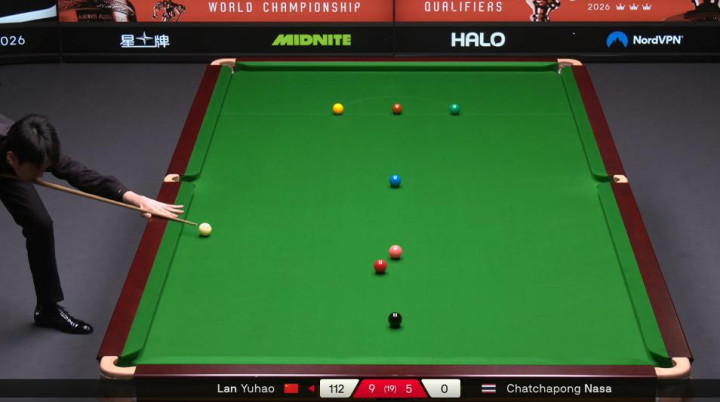 在本场比赛的最后一局,蓝裕豪打中袋红球上手,然后一路打进黑球,直奔147而去。