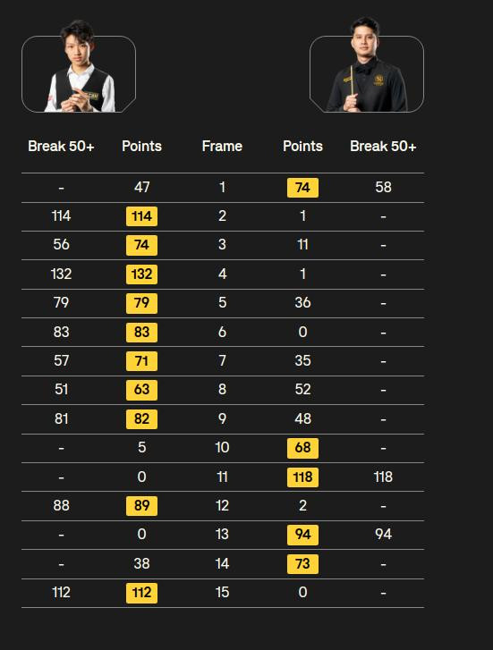 他赢下的10局,全部都是单杆过50,其中3杆单杆过百。而且,他在输掉第一局之后,连赢8局,显示出非常强的技术稳定性。