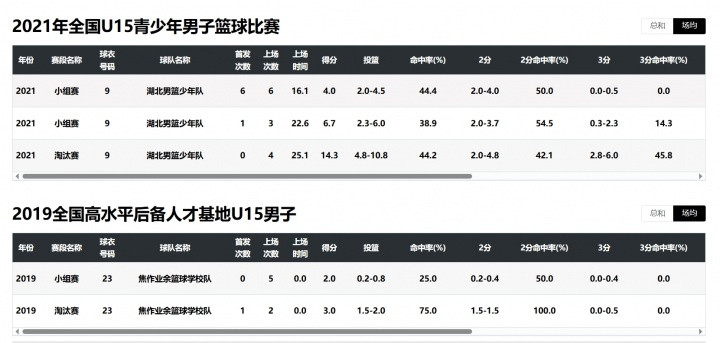 篮协官网比赛记录也佐证了这一点,张涵泊在19年和21年参加了两次U15的赛事,19年表现平平,但21年明显数据全面提升。