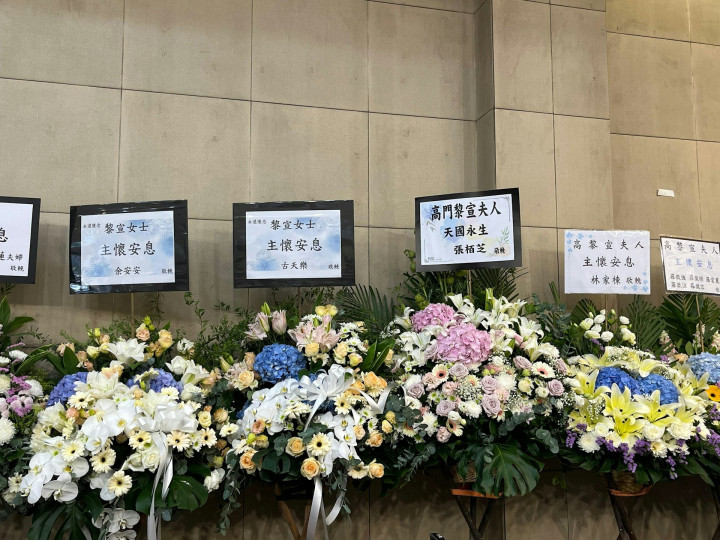 黎宣的灵堂布置简洁,横匾写上“主怀安息”,女儿透露她是基督徒,葬礼低调举行,考虑到台风将至,遗体已经在9月23日早上火化。