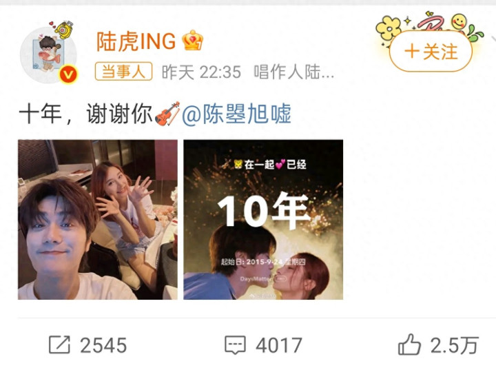 陆虎的发文也点明了这一点,他艾特陈曌旭说:“10年了,谢谢你。”