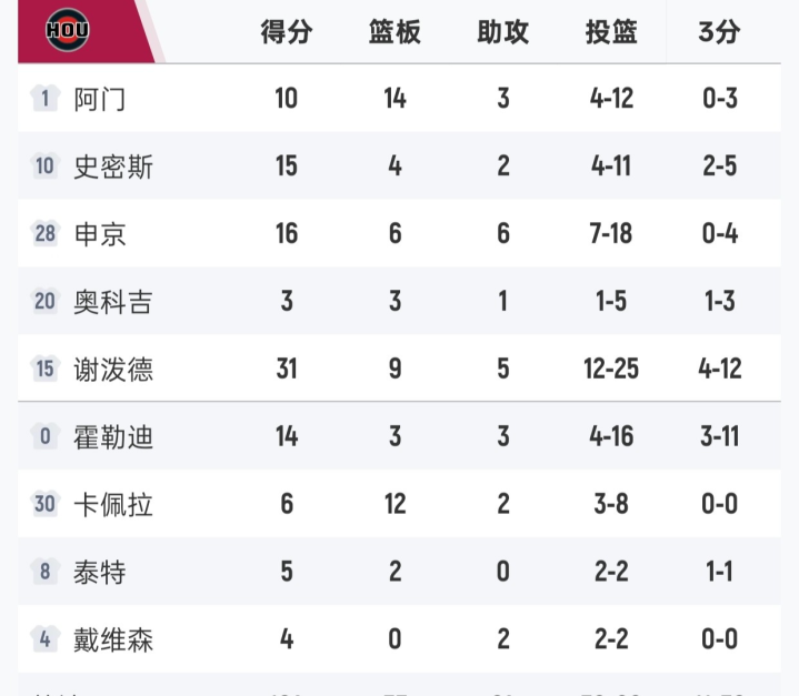 火箭队:阿门、史密斯、申京、卡佩拉、霍勒迪